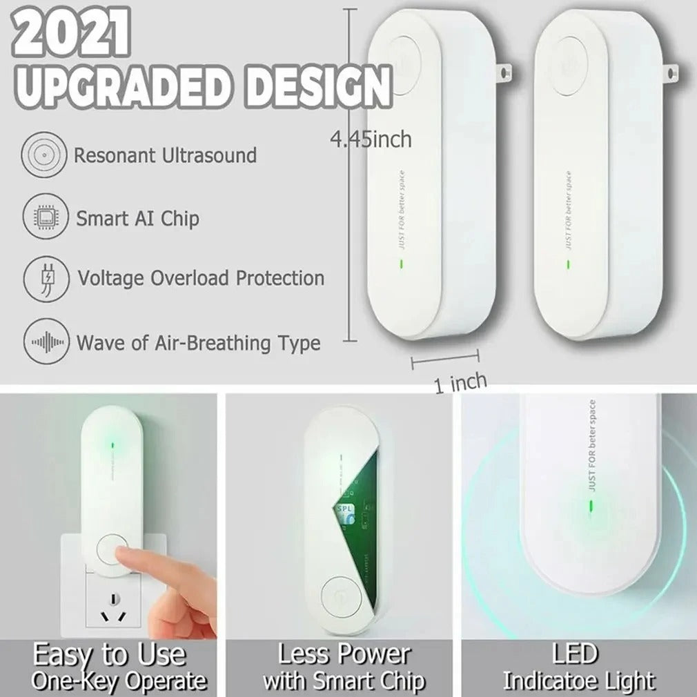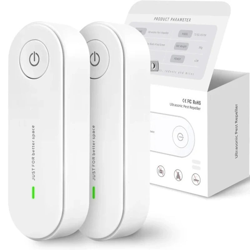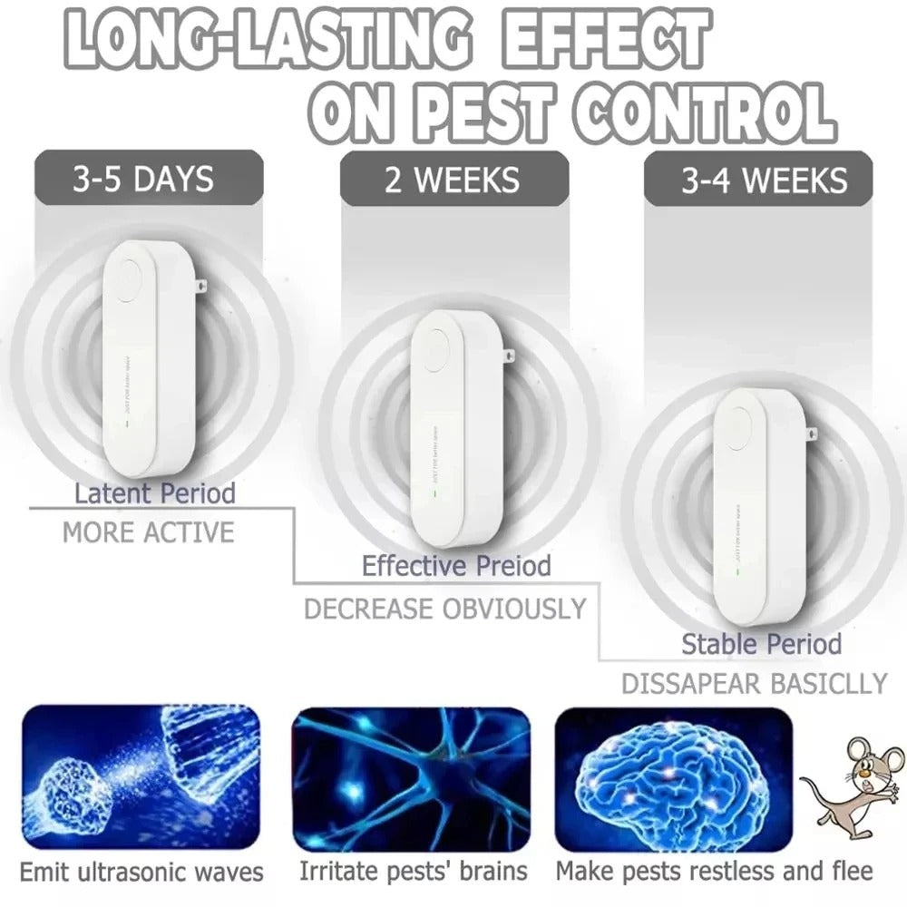 Este repelente ultrassônico utiliza a mais recente tecnologia de conversão automática de frequência para emitir ondas em diferentes bandas que perturbam os sistemas auditivo e nervoso de parasitas como ratos, moscas, ácaros e percevejos, forçando-os a fugir do seu ambiente.
